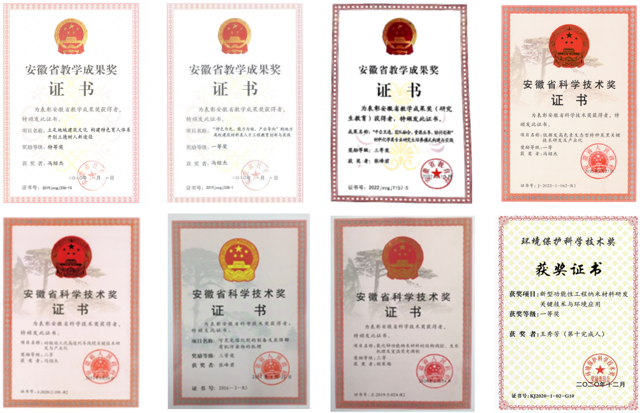 近年来,获安徽省教学成果奖3项,其中特等奖和一等奖各1项。获批教育部产学合作协同育人项目、安徽省重大教改项目、安徽省新型建筑材料现代产业学院等省部级教研项目20余项;承担国家自然科学基金、省部级科技项目20余项,获安徽省科技进步一等奖1项,二等奖1项,安徽省自然科学三等奖2项、环境保护科学技术一等奖1项。发表高水平学术论文100余篇,授权国家发明专利10余项,累计到账科研经费逾千万元。2023年化学学科进入ESI学科全球排名前1%