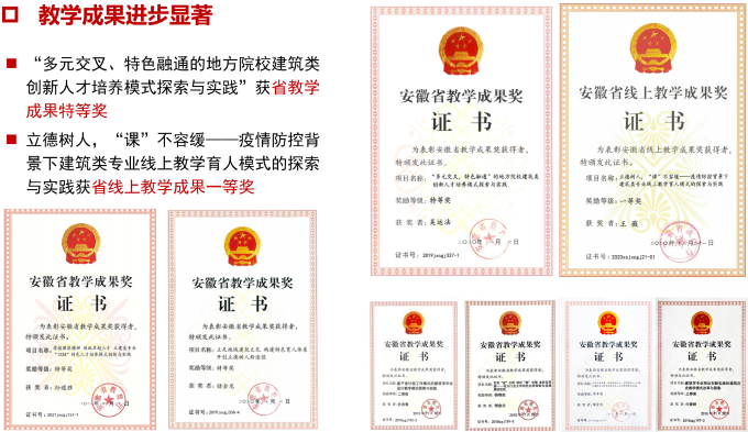 2、依托地缘优势,对地域建筑文化研究取得显著效果并反哺教学。立足徽州地域文化传承创新发展新需求,借助徽州传统村落与建筑研究的领先优势和卓越成果,结合专业办学历史长、学术积累深、技术力量强、区域影响大的优势,形成鲜明的专业特色。以建筑类创新特色应用型人才培养为专业发展核心的定位,在教学、科研、国际交流和设计实践中持续取得突出的成绩,所培养的学生的质量享誉国内外,为国家城乡建设以及安徽的地方建设发展做出突出贡献。