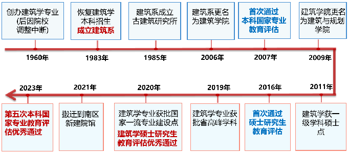 1960年创办建筑学专业,1983年成立建筑系,招收四年制本科,1995年改为五年制。建筑学专业分别于2007、2011、2015、2019、2023年通过住建部专业教育评估,2023年获得国家专业教育评估优秀通过。现为国家级一流专业、安徽省特色专业建设点、安徽省品牌专业、安徽省人才培养模式创新试验区、安徽省卓越人才教育培养计划实施单位。建筑学为学校重点学科、“安徽省新增博士学位授予权建设单位”建设学科和安徽省高等教育振兴计划重点建设学科。2007年获二级学科硕士点授权,2011年获一级学科硕士学位授予权,2016年,通过硕士研究生教育评估,2020年在全国高等学校建筑学专业研究生教育评估以优秀等级通过。
