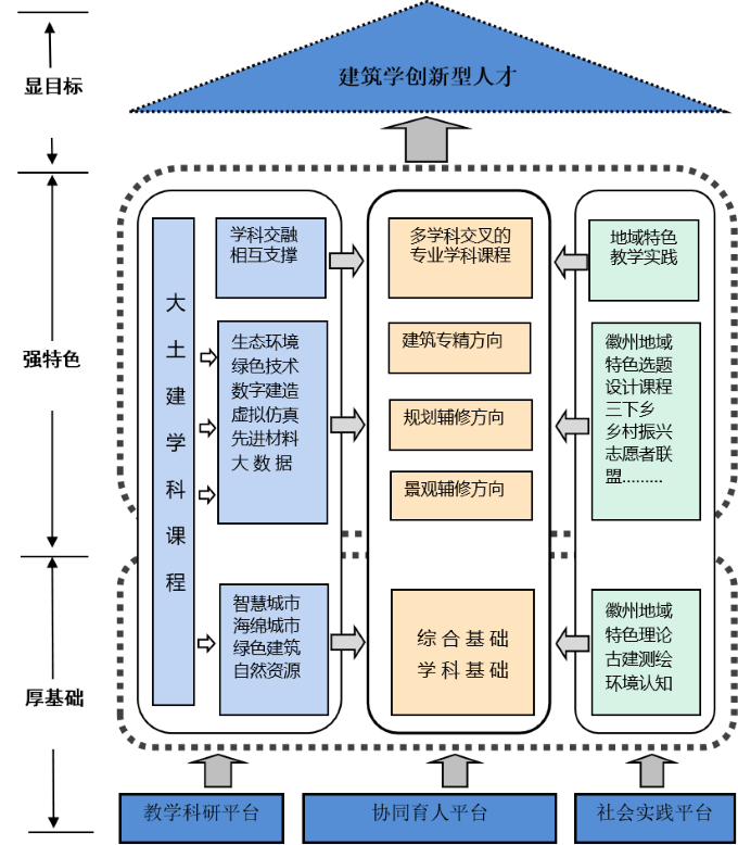 1、依托学校土建类学科齐全的优势,形成资源共享、学科交叉的综合平台。学校土建类学科专业齐全、学科门类涵盖七大类的优势,建筑学专业在公共课程设置和师资配备上,注重发挥学校地方优势,持续完善“2+3”培养模式,全面巩固学生知识结构,拓宽学生专业适应能力。