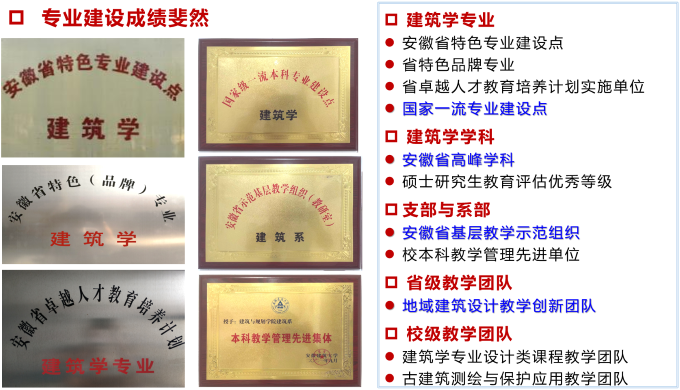 4、根据地方经济社会建设需求,持续推进安徽城乡特色建设。拥有传统村落与古建筑保护利用、徽州文化传承及其建筑表达的高水平团队和科研平台,强化产教、科教、校企融合,培养了一大批具有徽匠精神的建筑大师、设计院院长、行业管理人才。立足地域特色和学科优势,面向科技发展的全周期工程教育,成为我国建筑设计与管理特色人才培养和科学研究的重要基地,被誉为“皖江建筑人才的摇篮”。(作者:许杰青;审稿:唐劲松)