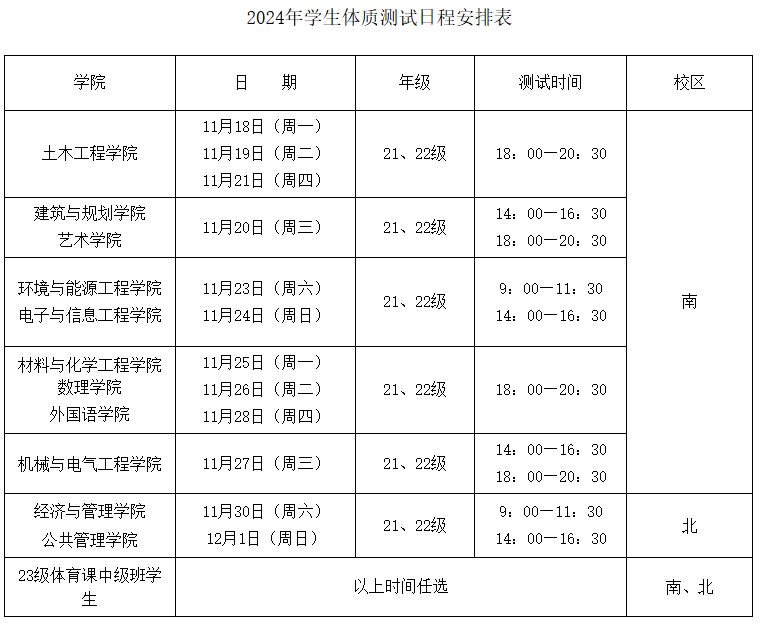 四、测试时间:21、22级全体学生及23级体育课中级班学生测试时间为课外活动及周末(具体安排见下表),23、24级体育课初级班学生由体育课任课教师自行安排。
