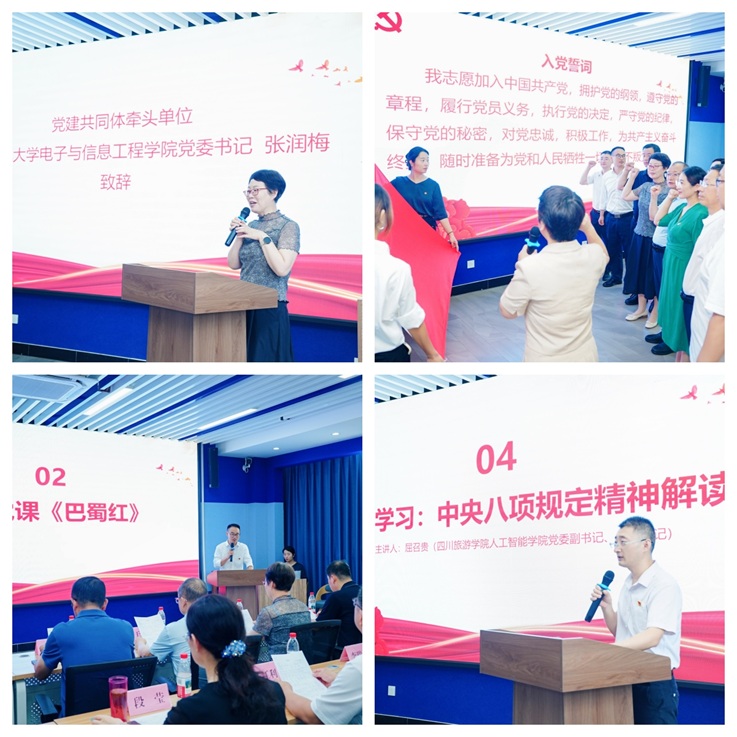随后,一堂独具特色的《巴蜀红》音乐党课精彩上演。党课以艺术形式生动展现了巴蜀大地深厚的红色基因与革命精神,引发与会者强烈共鸣。在庄严的党旗前,全体与会党员重温入党誓词,铿锵誓言彰显了不忘初心、牢记使命的坚定信念。四川旅游学院人工智能学院党委副书记、纪委书记屈召贵结合高校科研经费、师德师风等典型案例,对中央八项规定精神进行再解读,为党建共同体成员强化纪律意识、筑牢思想防线提供了理论指引。