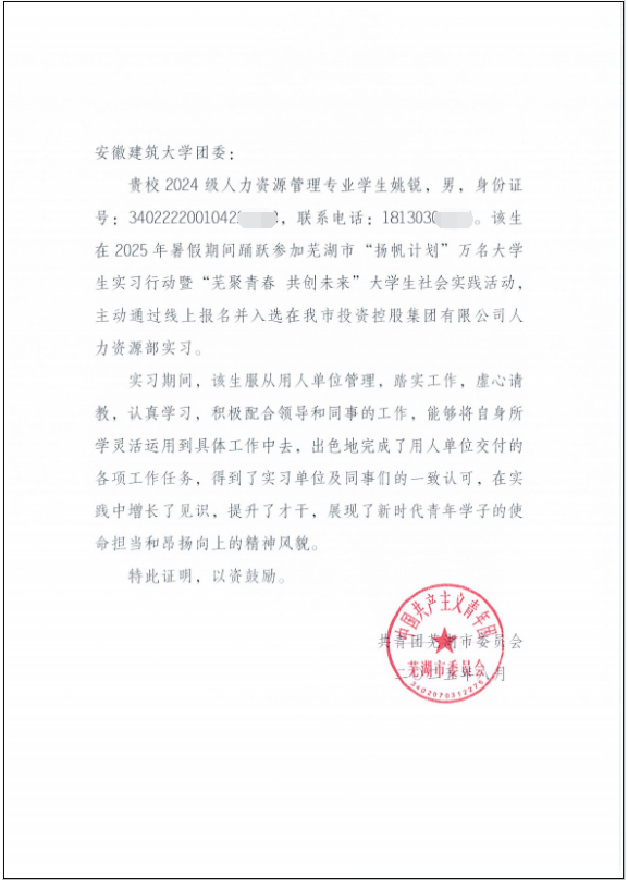 本网讯 近日,学校收到共青团芜湖市委员会发来的表扬信,对公管学院2024级人力资源管理专业学生姚锐,在“扬帆计划”实习实践活动中的出色表现给予高度认可与赞扬。