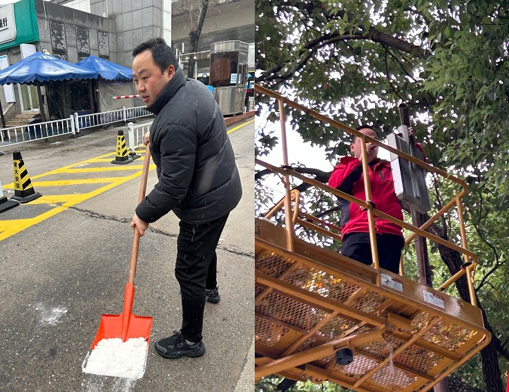 春日里,他带着团队开展大清扫、大整治行动,爬梯子清理墙角蛛网,蹲下身擦拭公共设施,让暖阳下的校园焕发新颜;暴雨突至时,他披着雨衣蹚着积水排查下水道,在低洼处放置警示标识,直到确认无一处积水隐患才离开;开学季的校园里,他组织爱心车队,红蓝色马甲的身影穿梭不停地帮新生搬运行李;寒冬来临前,他带着师傅们给水管裹保温棉,在结冰路段铺防滑垫,把暖冬计划的每一项措施落到实处。