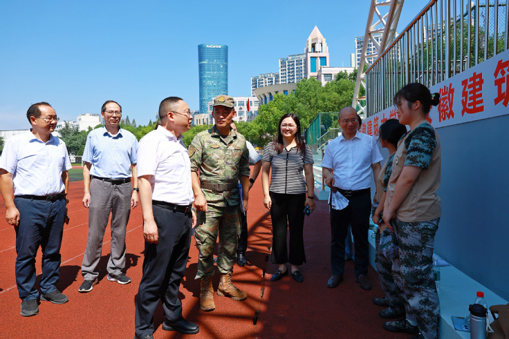 军训训练场青春飞扬、口号嘹亮高跃峰学院领导和老师的陪同下,看望金寨路校区2025级新生军训新生现场,身着迷彩服的新生们精神抖擞,在教官的带领下高声传唱《强军战歌》;尽管额头的汗水顺着脸颊滑落,他们依旧保持着挺拔的姿态。高跃峰亲切慰问正在参训的新生和带队教官仔细询问军训科目安排、后勤服务保障及新生适应提醒教官科学施训、劳逸结合,确保军训安全有序开展。