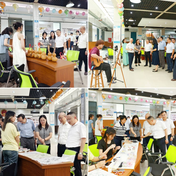 高跃峰一行走访建树楼一楼学生社团活动中心看了朝含国学制作的发簪工艺品书法作品、非物质文化遗产——葫芦烙画聆听了传韵戏曲美育工作室和嘻哈研究社同学们的精彩演唱。他认真听取社团负责人对社团特色和活动开展情况的介绍,对各社团丰富校园文化、提升校园文化底蕴,给予了高度认可与充分肯定。